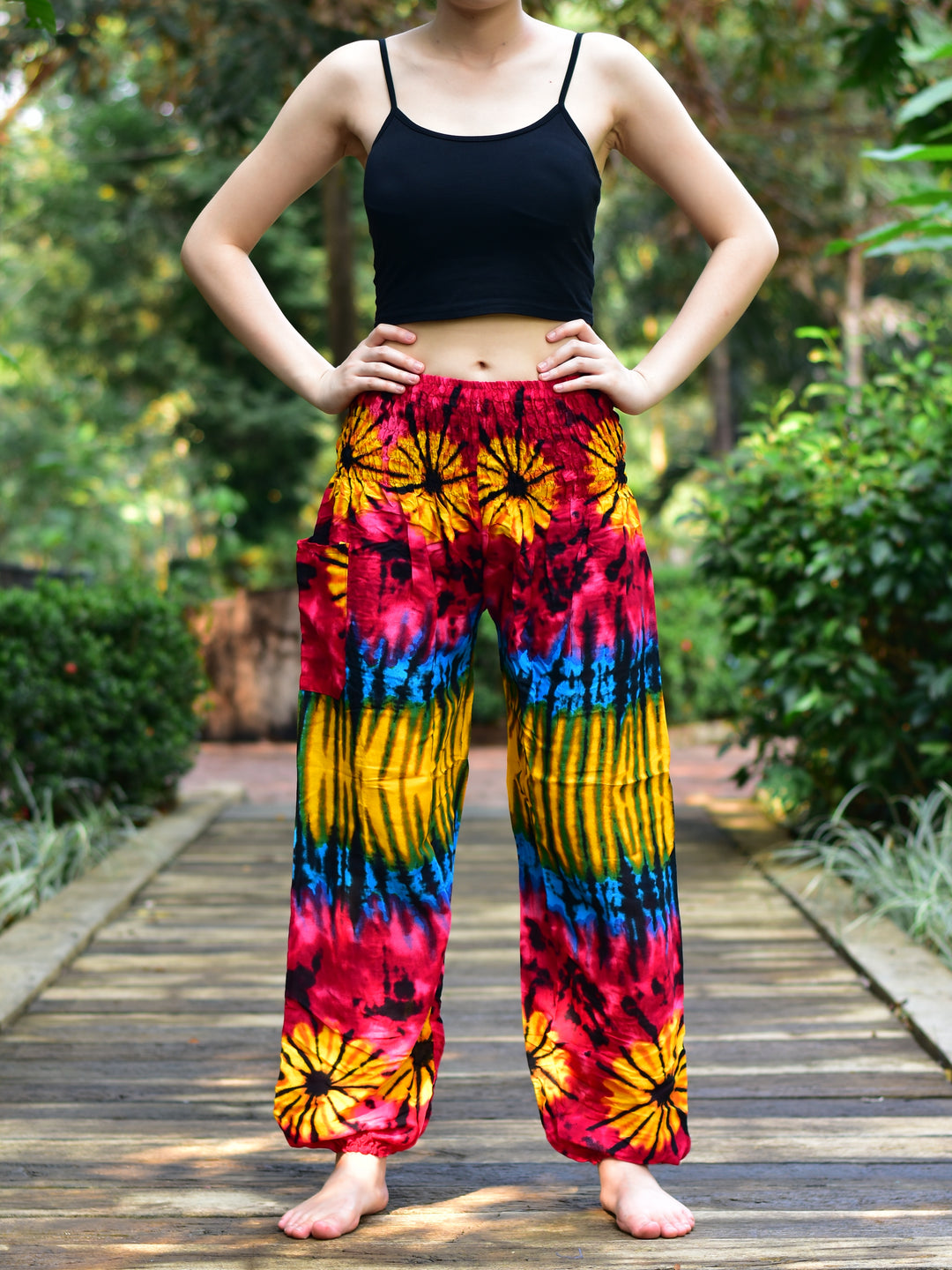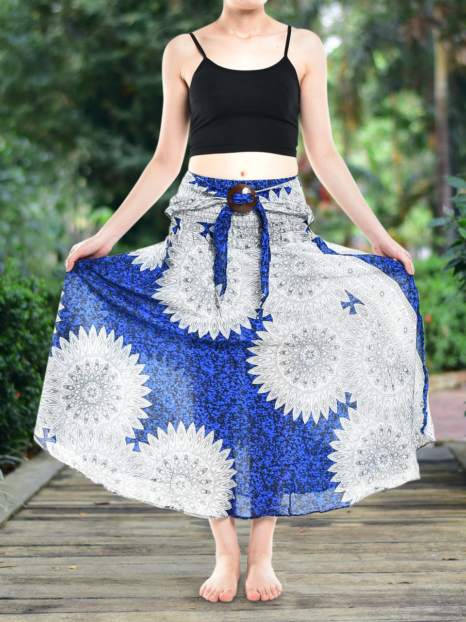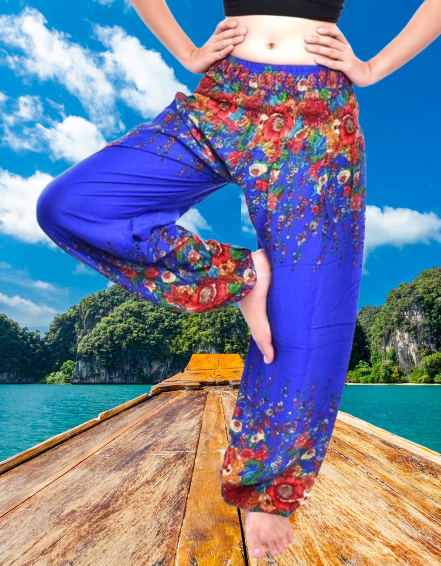 Bohotusk Blue Thai Flower Print Elasticated Smocked Waist Womens Harem Pants S/M only