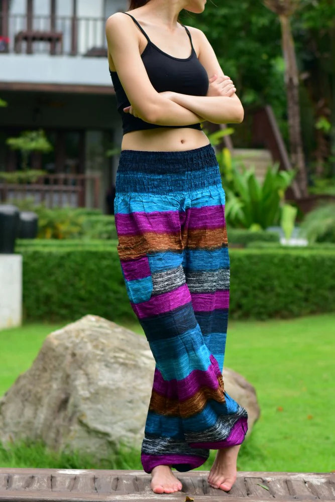 Our women's harem pants with elasticated waists are designed to fit and flatter a variety of body types, ensuring you feel confident and comfortable. Made from high-quality Royal Thai Rayon, these pants are perfect for yoga, lounging, festivals, and everyday wear.
